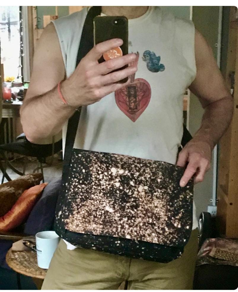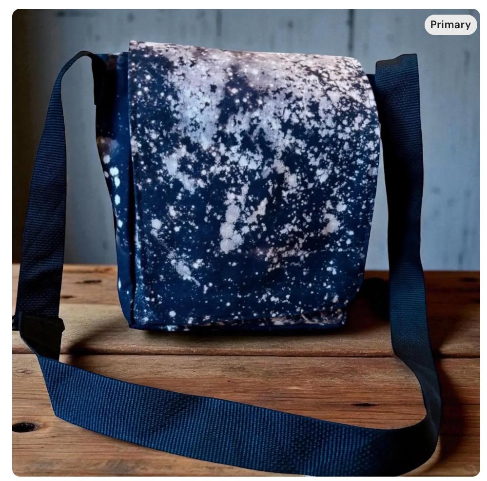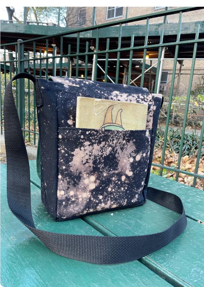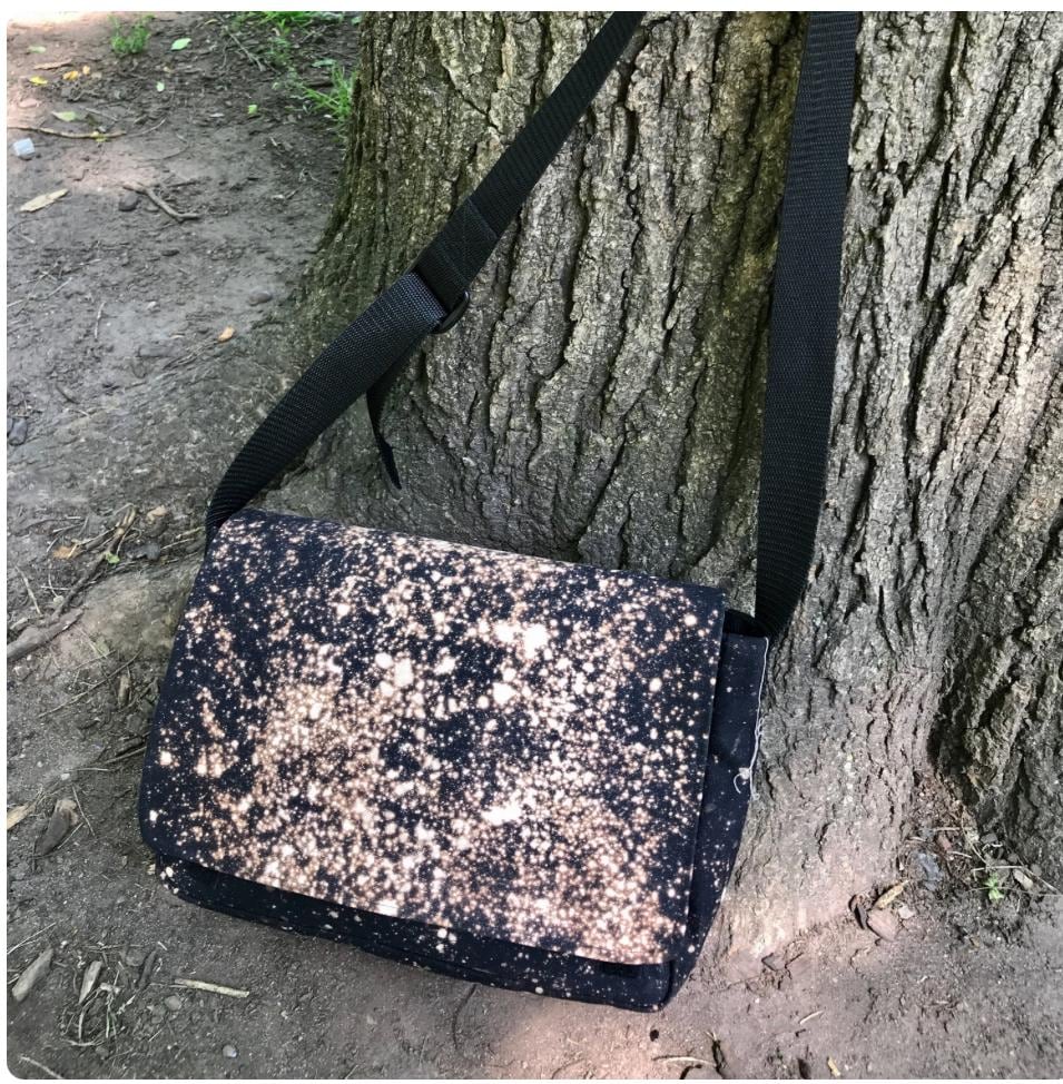 The reverse dye process pulls the color out of the black canvas creating a unique and beautiful effect, making each bag one of a kind. Our messenger style bag features two interior pockets and two exterior pockets, a adjustable webbing strap and a Velcro closure.